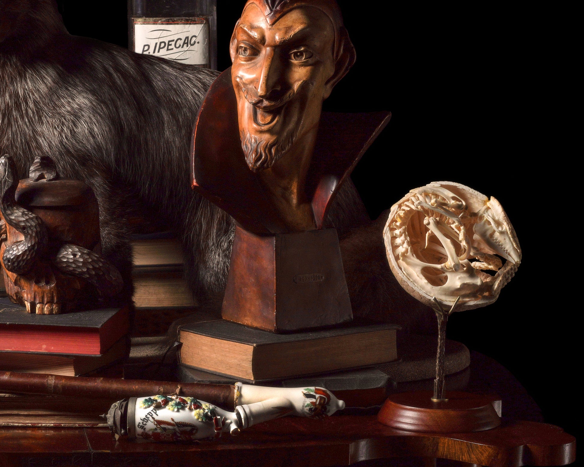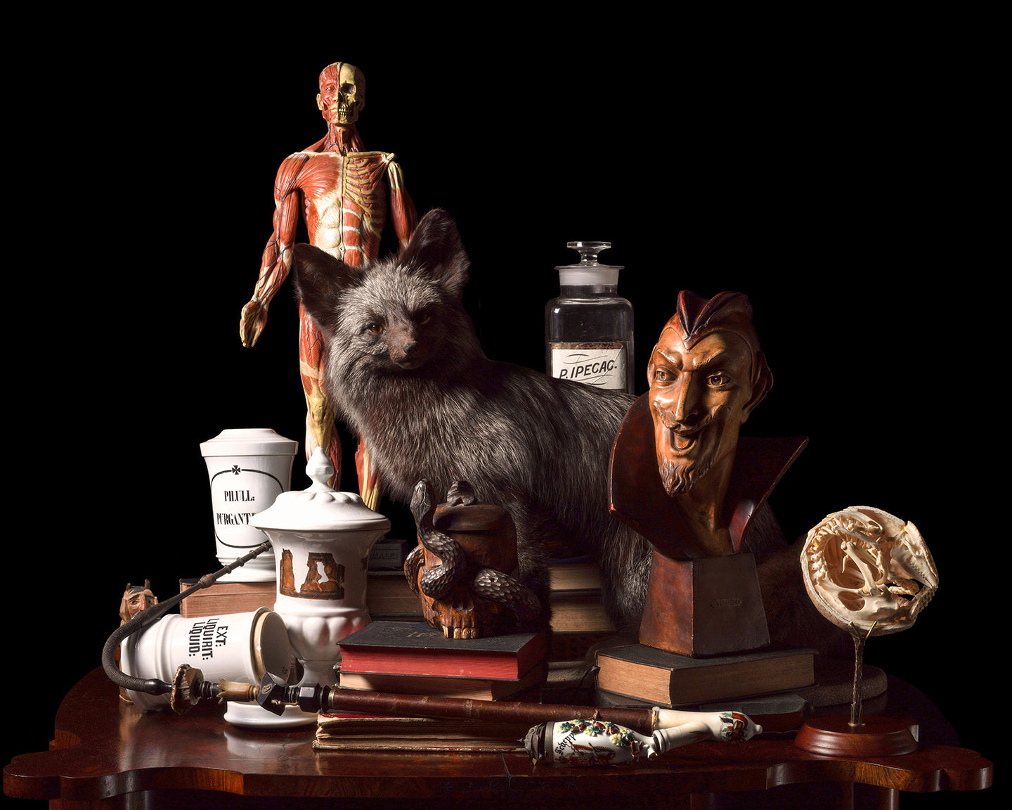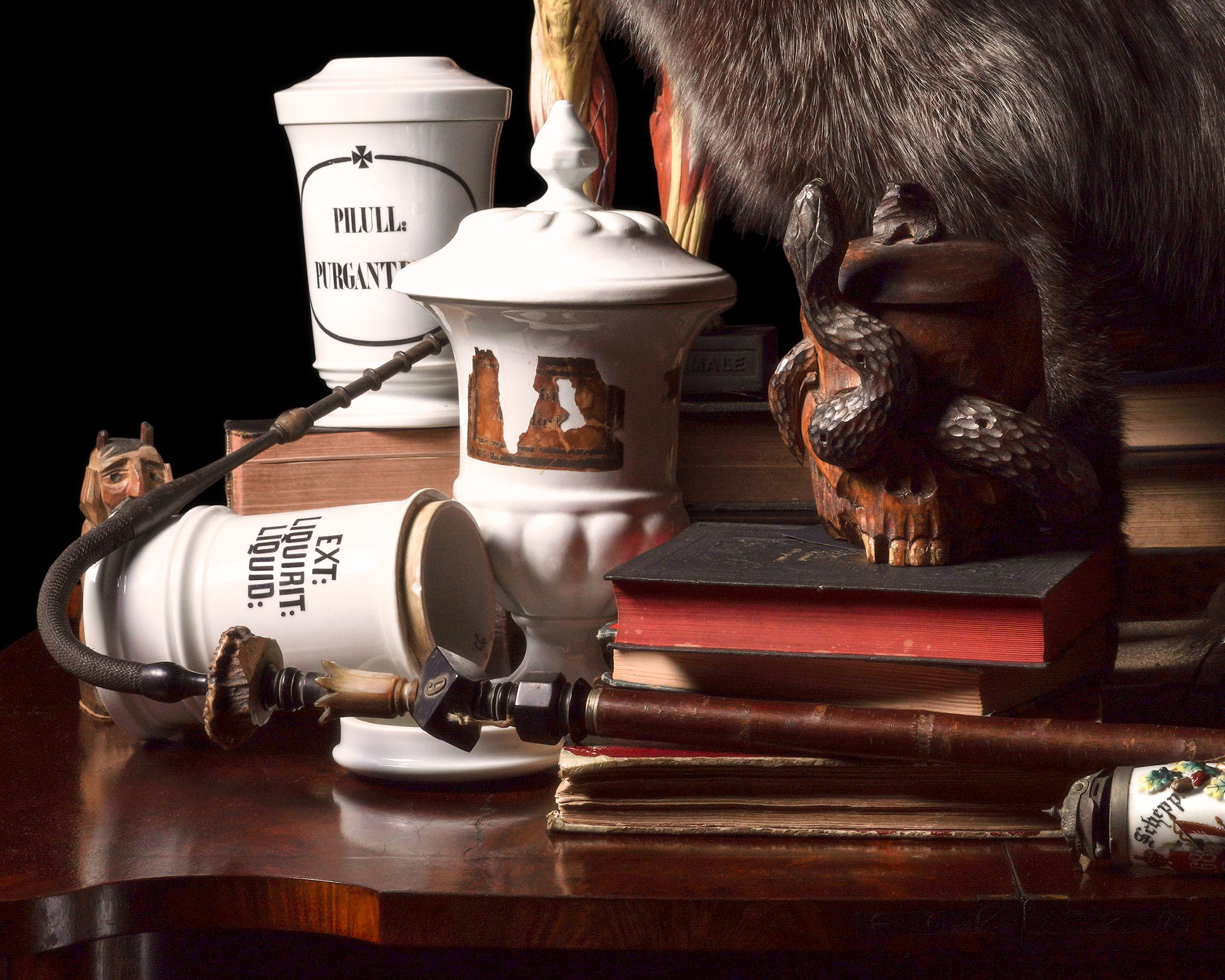 ‘Apotheca‘ is part of the ongoing Veneration of Light series which encompasses works of Neo-Victoriana still life images. Veneration of Light was inspired by the artist’s own contemplation of the temporality of life through observation of its ephemera focusing on botany, taxidermy, entomology, oddities, and antiques.