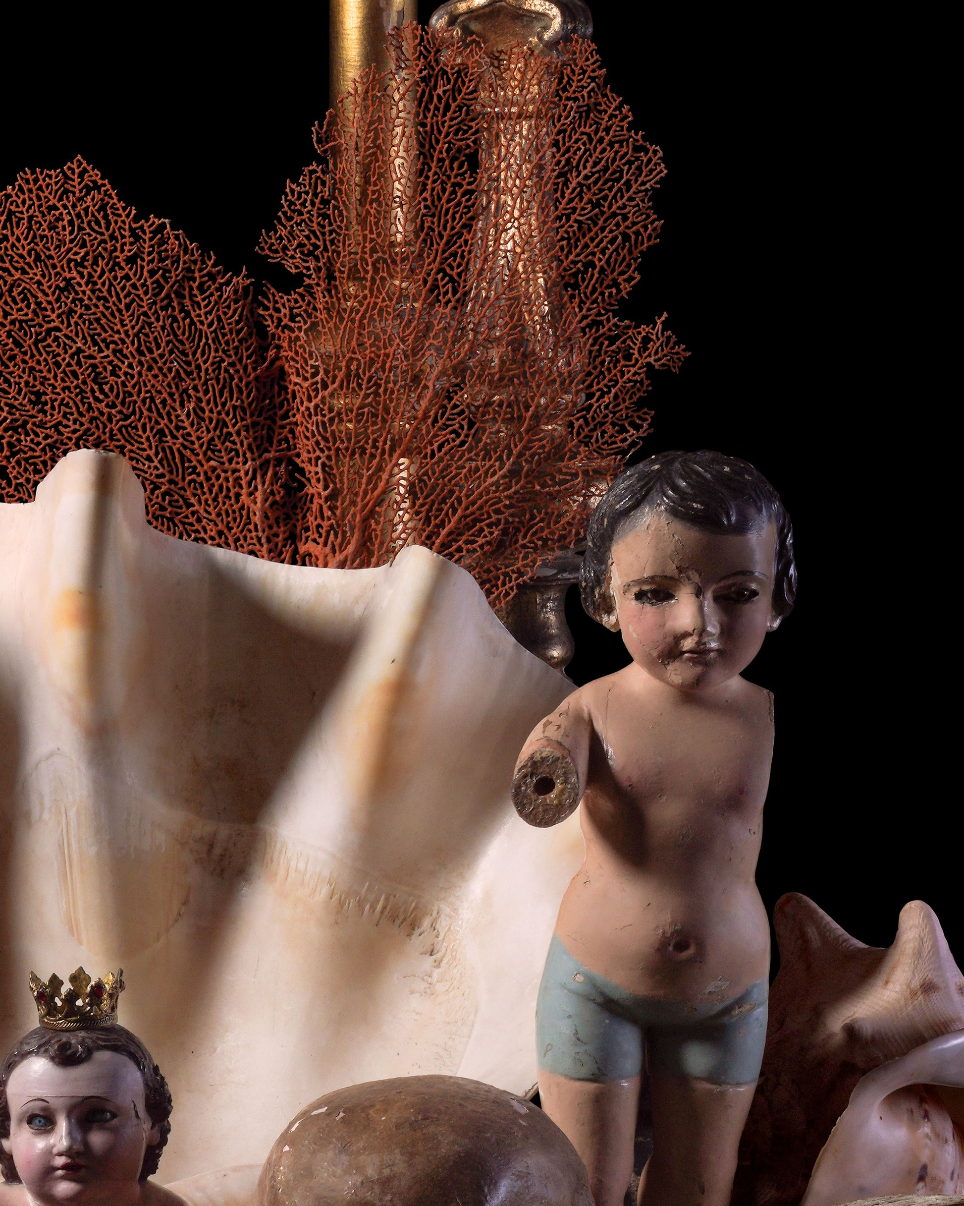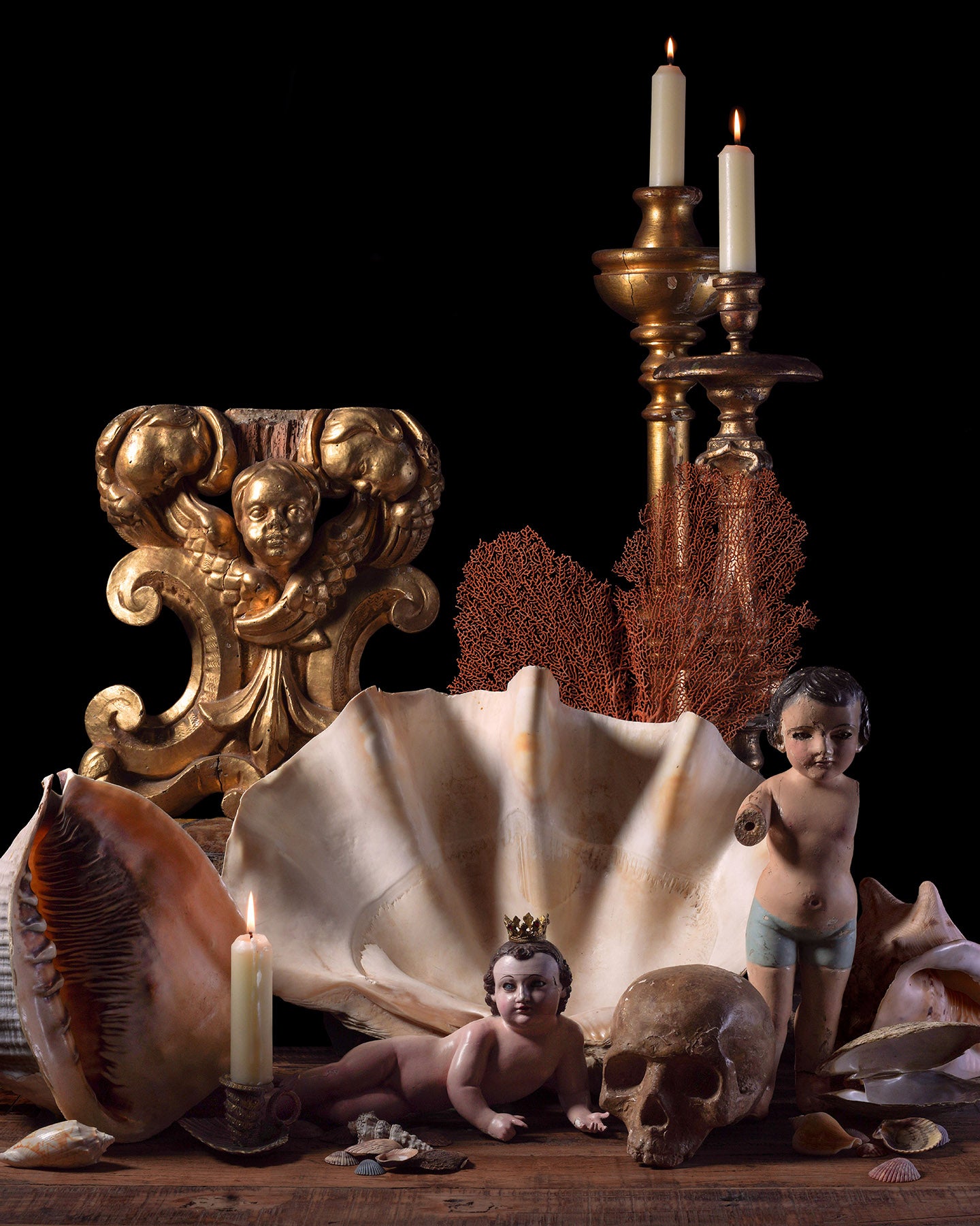'Aqua Sacra' explores the tension between past and present, the enduring themes of mortality and luxury, and the continuous evolution of the still life genre. Captured with meticulous attention to form, texture, and light, the image employs a modern photographic clarity that accentuates the inherent details of each object. The composition utilizes chiaroscuro lighting to create a dramatic interplay of light and shadow to move the eye through the narrative of the image. 'Aqua Sacra' is part of the ongoing Onweacnan series which encompasses works of neovictoriana still life.
