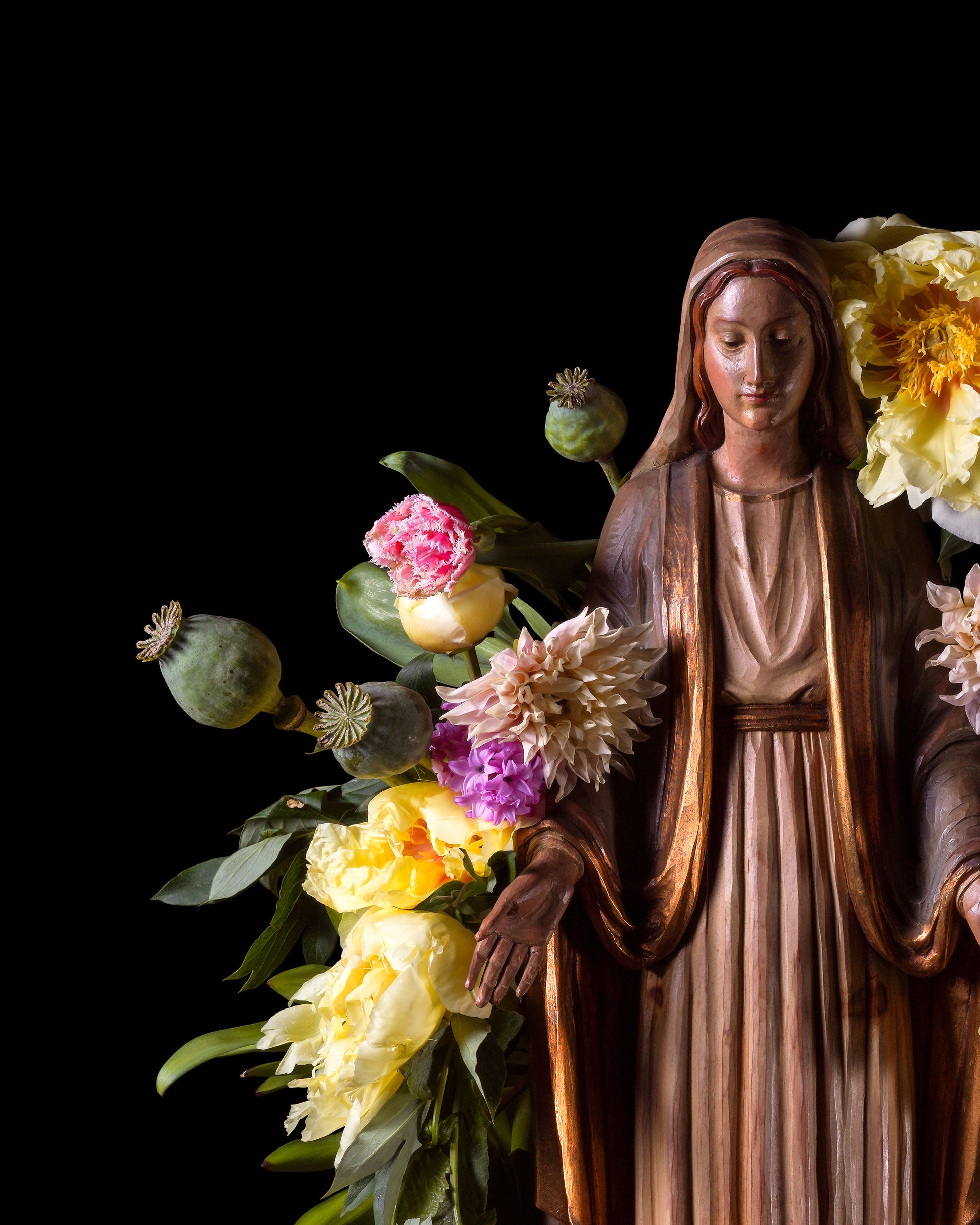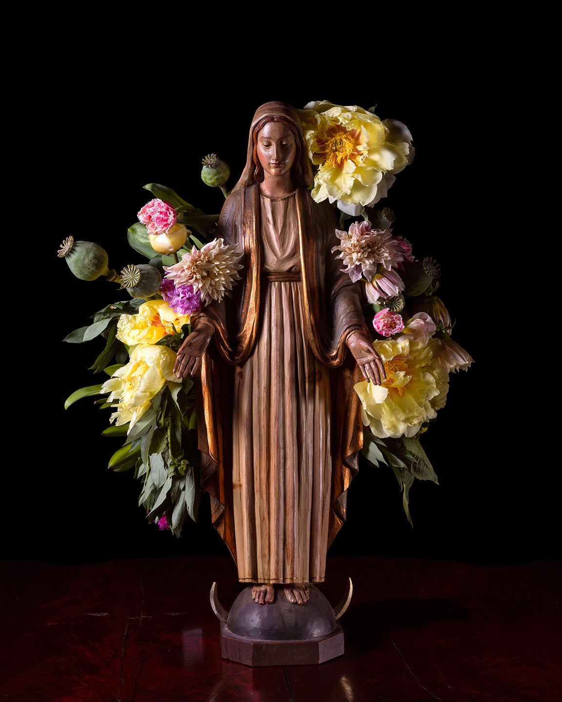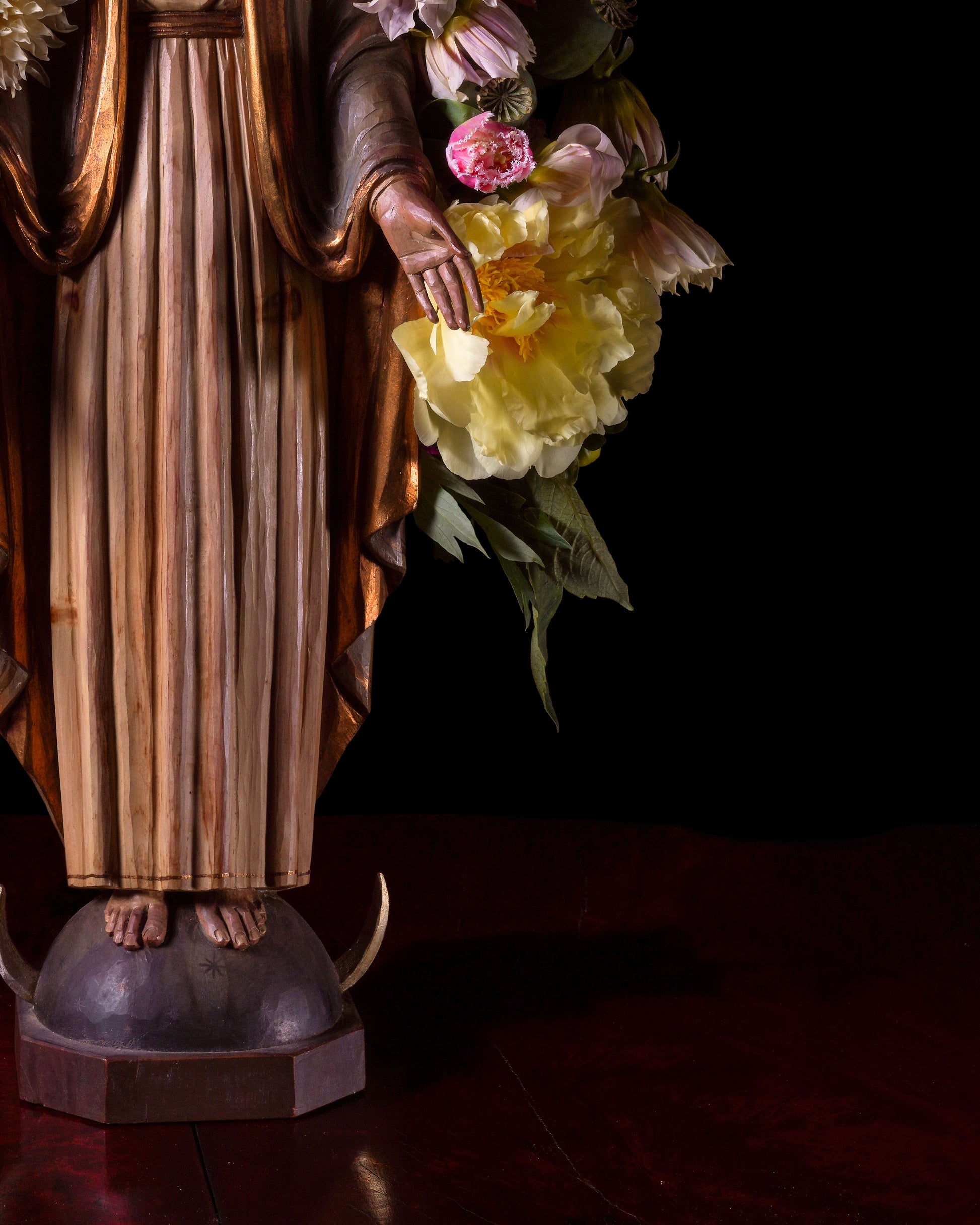 'Beatificus' is part of the ongoing Onweacnan series which encompasses works of neovictoriana still life. Onweacnan was inspired by the artistโs preoccupation with our impermanence and the death rituals of cultures across time and the globe. Pulling from the vanitas tradition of seventeenth century Dutch Masters, the work combines contemporary mediums with Renaissance styling to speak to modern viewers of mortality, connection, and encourage inner contemplation.
