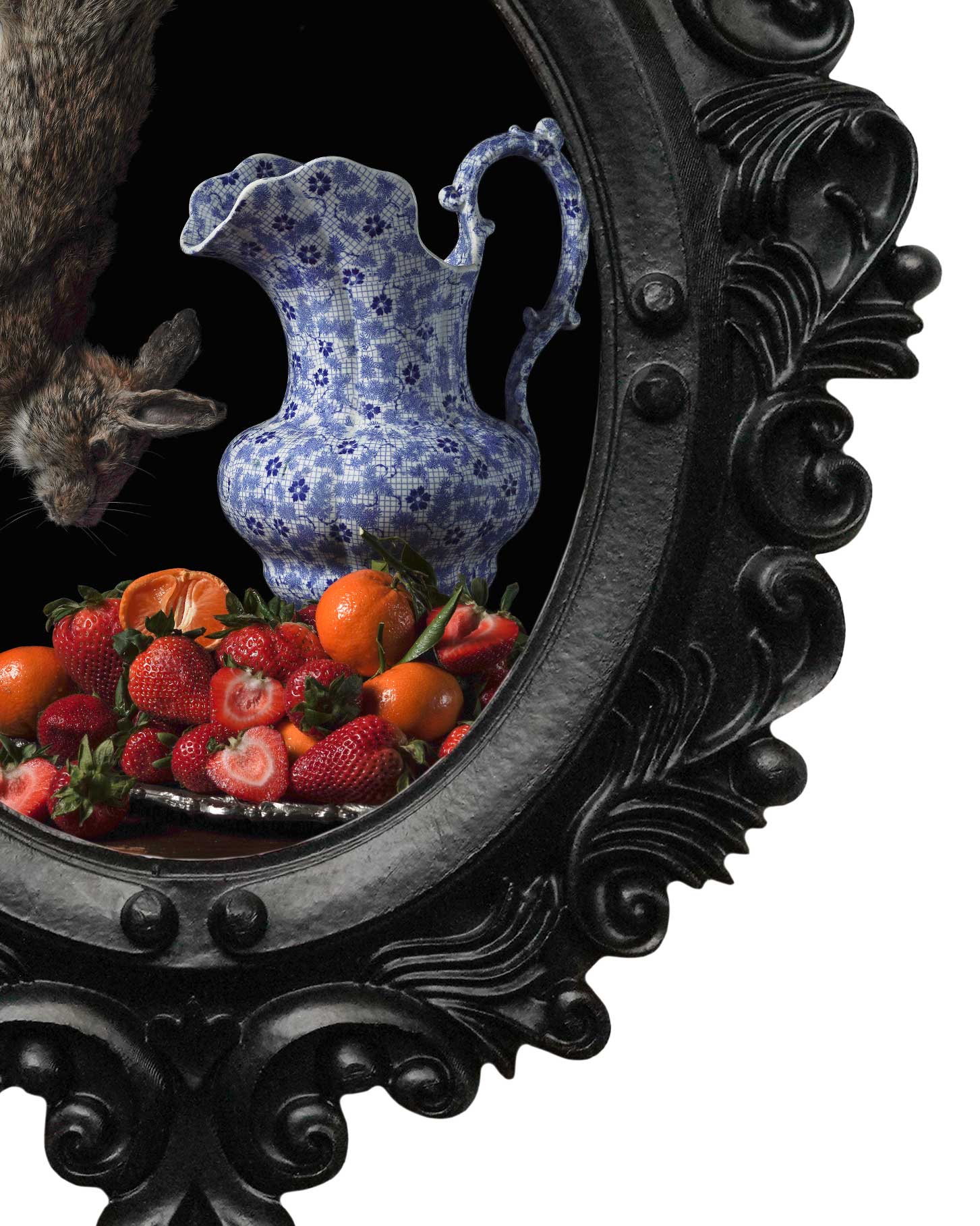 'Cyclus' is a true study in texture and color, with a focus on the soft fur of a rabbit placed alongside the lush, saturated hues and varied skins of fresh fruit.