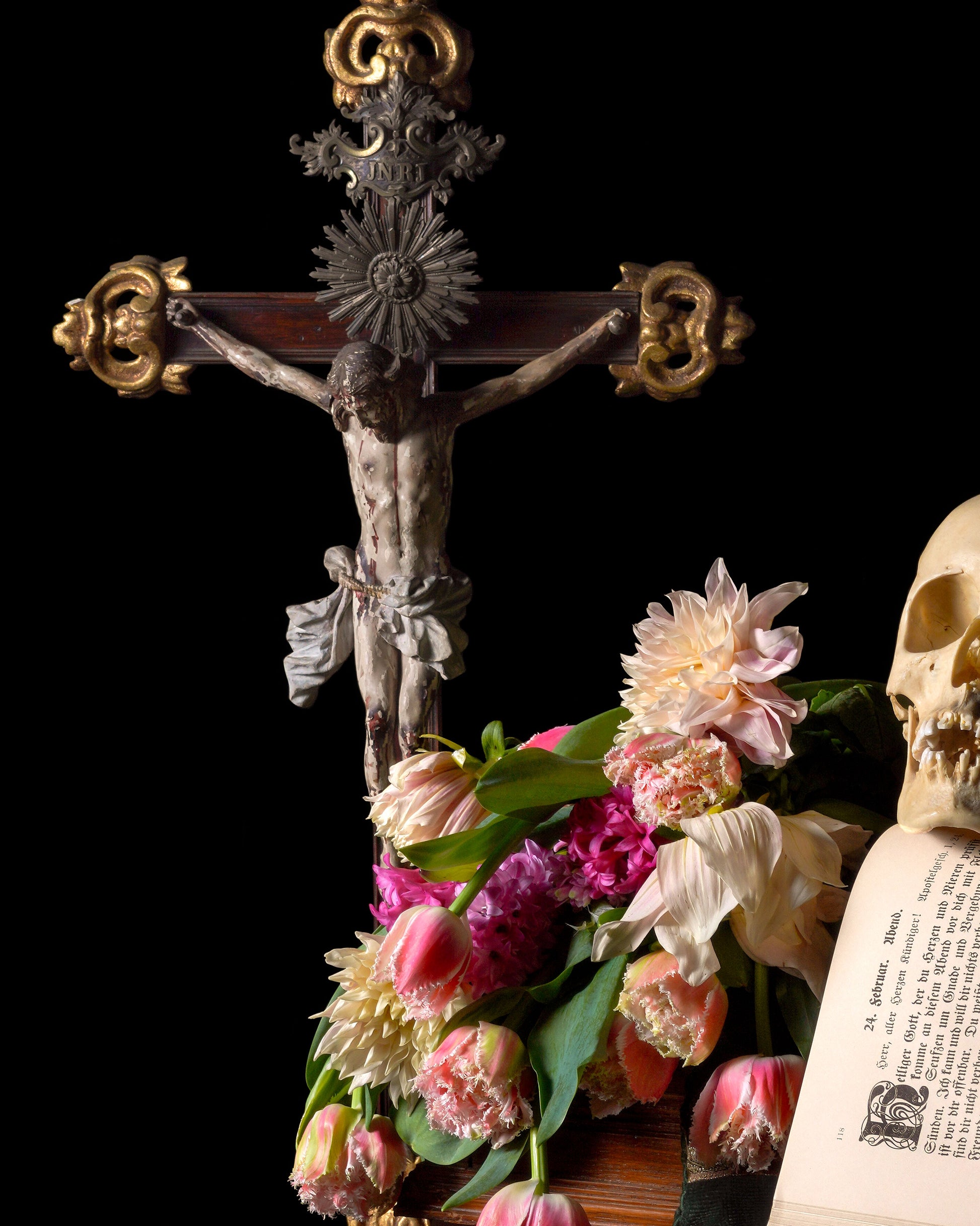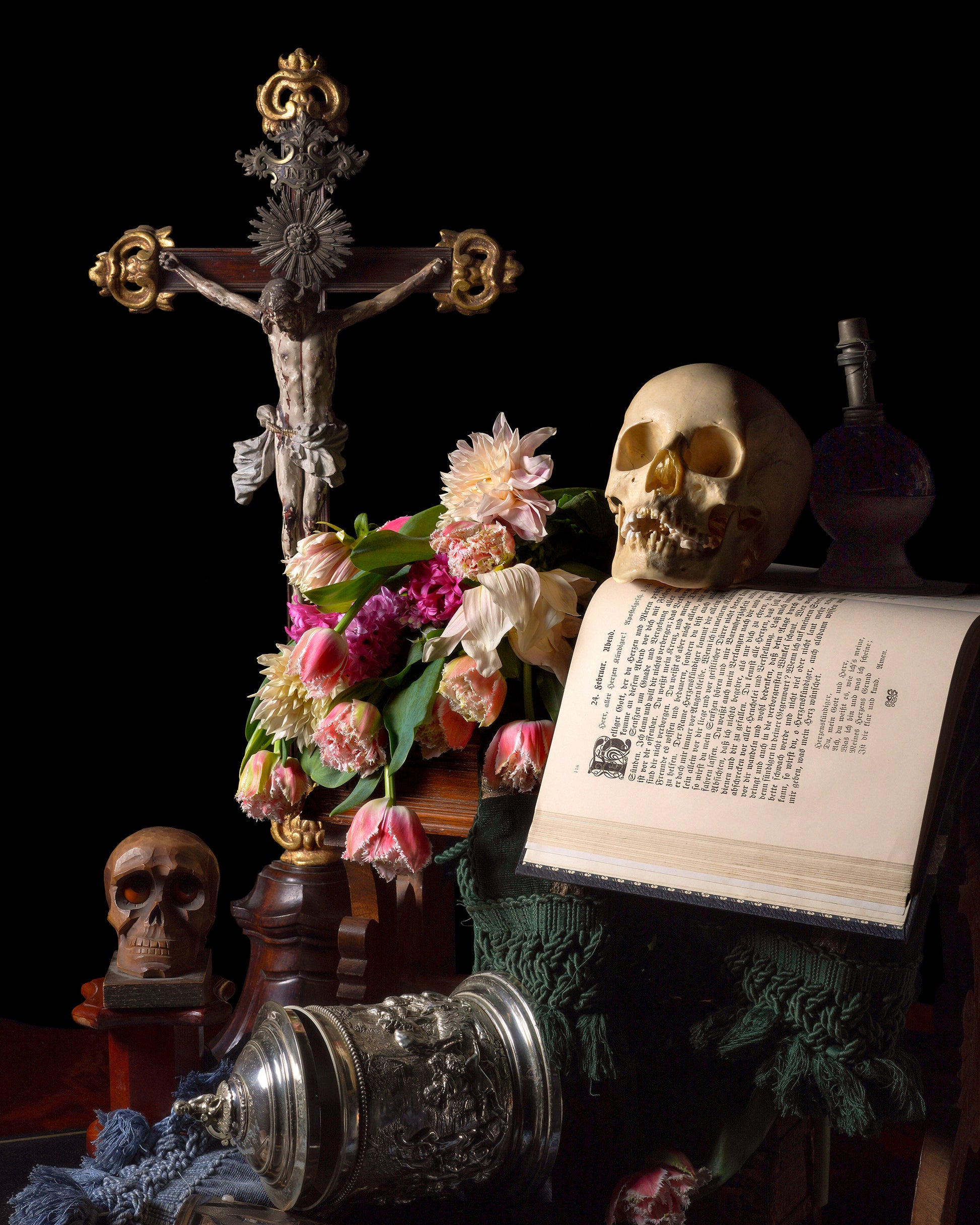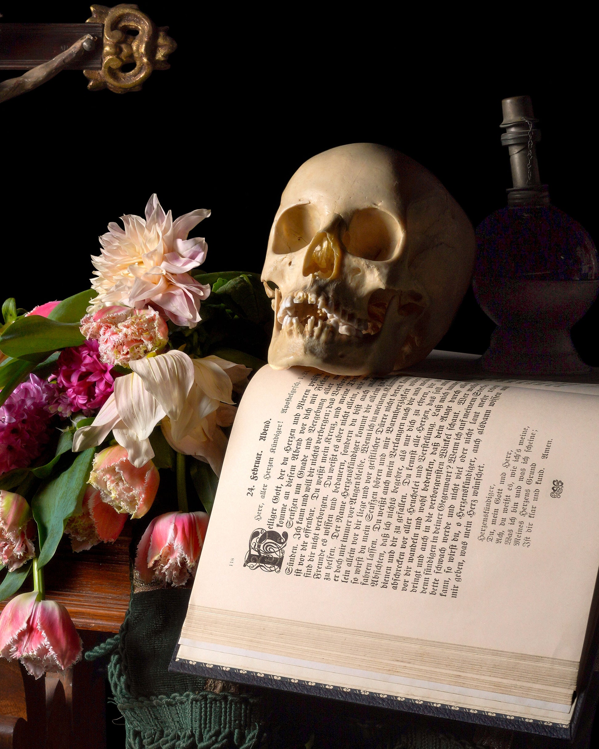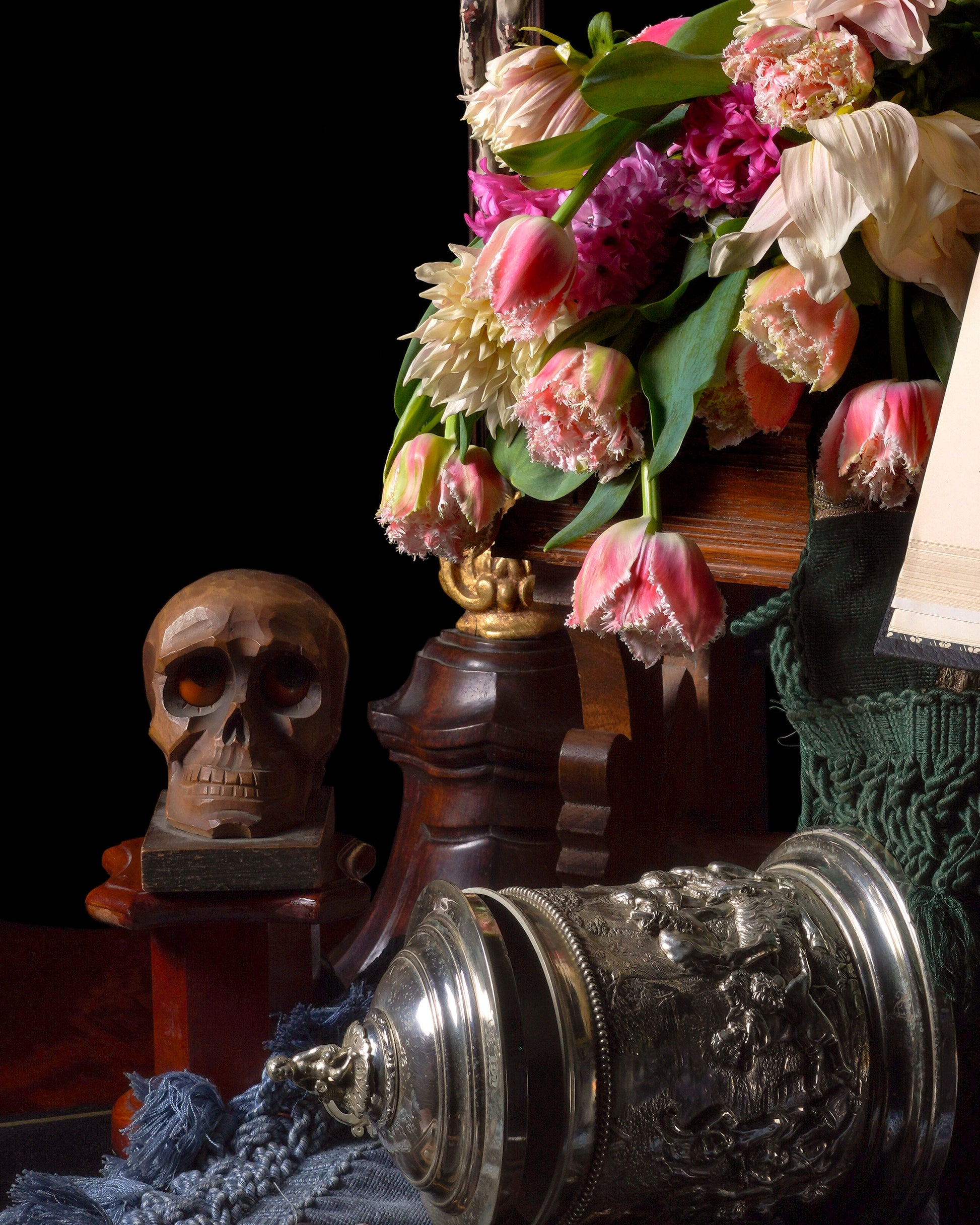 'Flēotan' is part of the ongoing Onweacnan series which encompasses works of neovictoriana still life. Onweacnan was inspired by the artist’s preoccupation with our impermanence and the death rituals of cultures across time and the globe. Pulling from the vanitas tradition of seventeenth century Dutch Masters, the work combines contemporary mediums with Renaissance styling to speak to modern viewers of mortality, connection, and encourage inner contemplation.