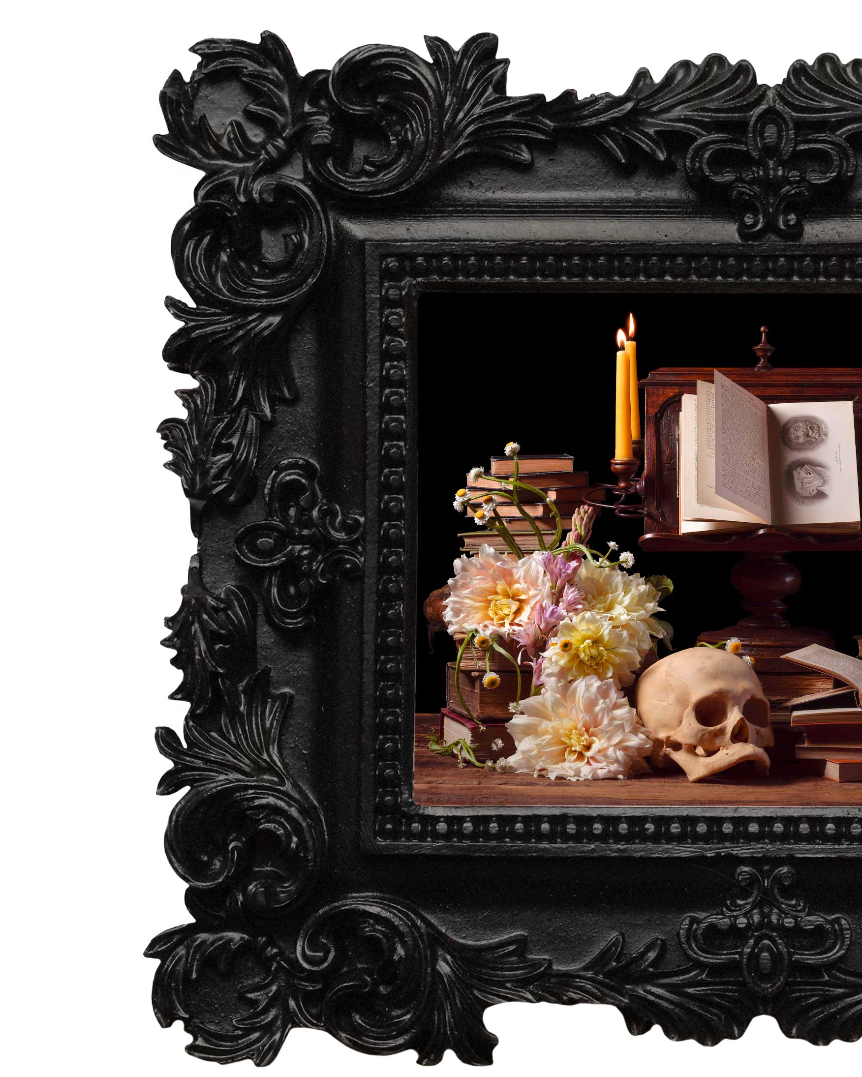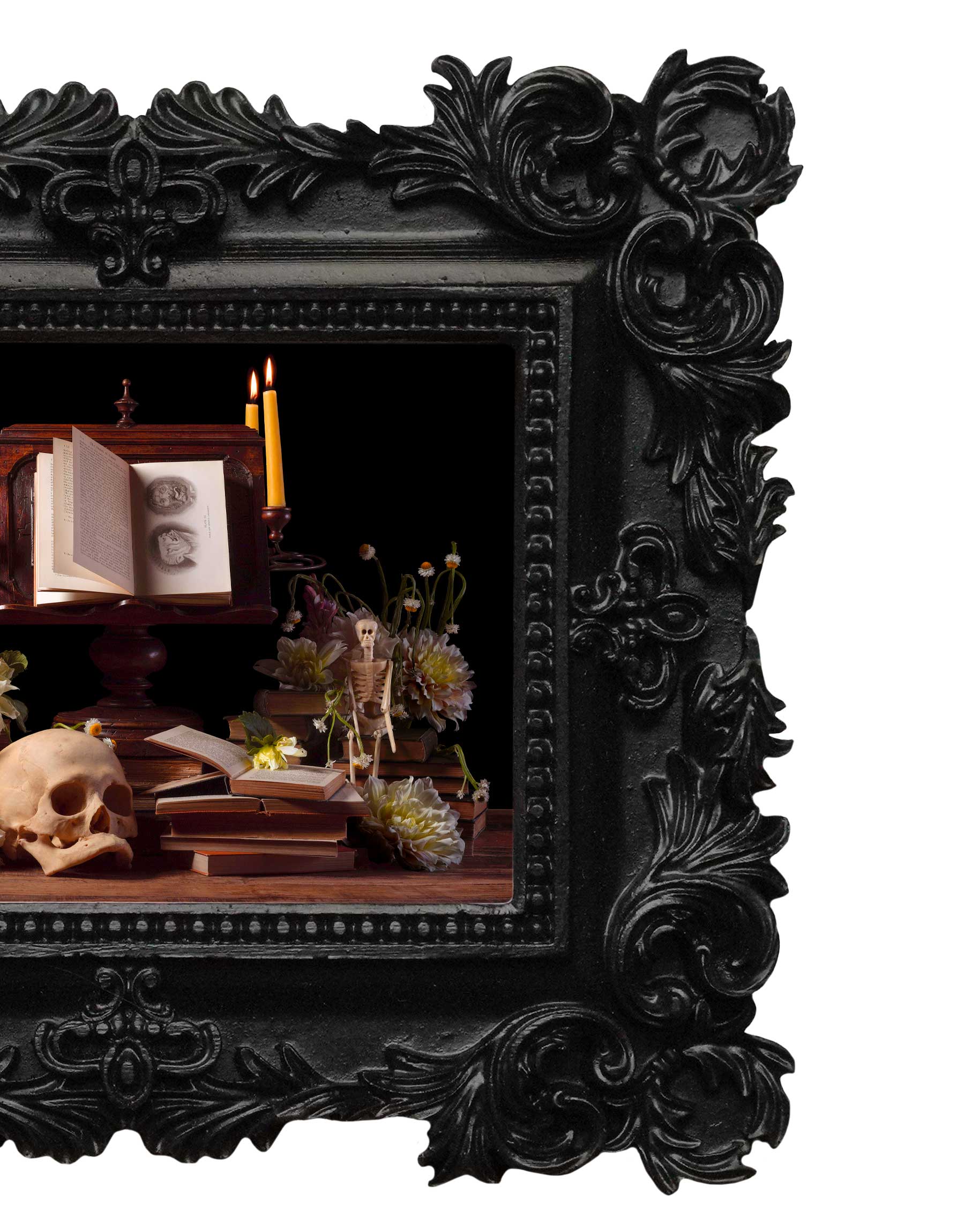 Created in the tradition of 17th memento mori, 'Monstrum' explores themes of mortality and transience. Vanitas still lifes were historically popular in Northern Europe as a means to encourage contemplation of the brevity of life and the futility of worldly pursuits. Add the perfect accent to your curio cabinet or shelves with this Mini Frame Print.
