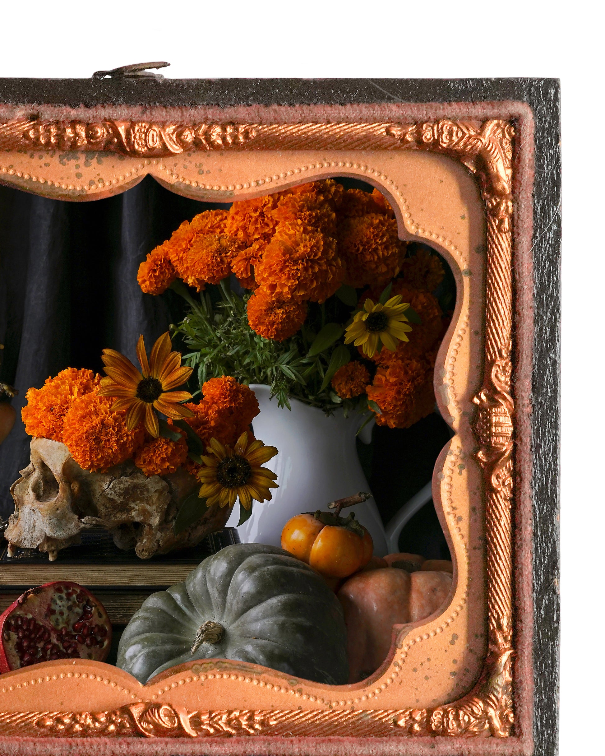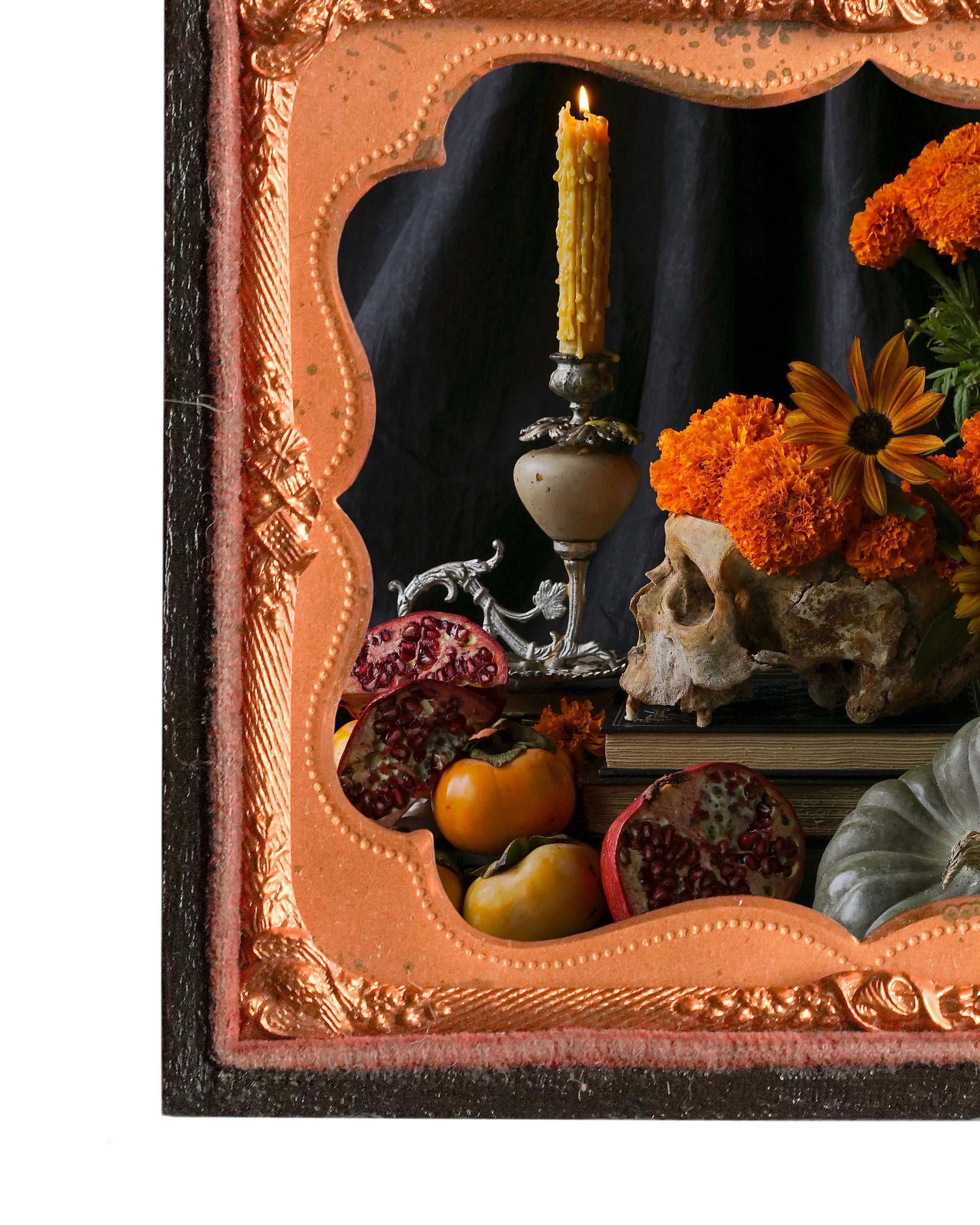 'Sanguis' is part of the ongoing Onweacnan series which encompasses works of neovictoriana still life. Onweacnan was inspired by the artist’s preoccupation with our impermanence and the death rituals of cultures across time and the globe. Pulling from the vanitas tradition of seventeenth century Dutch Masters, the work combines contemporary mediums with Renaissance styling to speak to modern viewers of mortality, connection, and encourage inner contemplation.