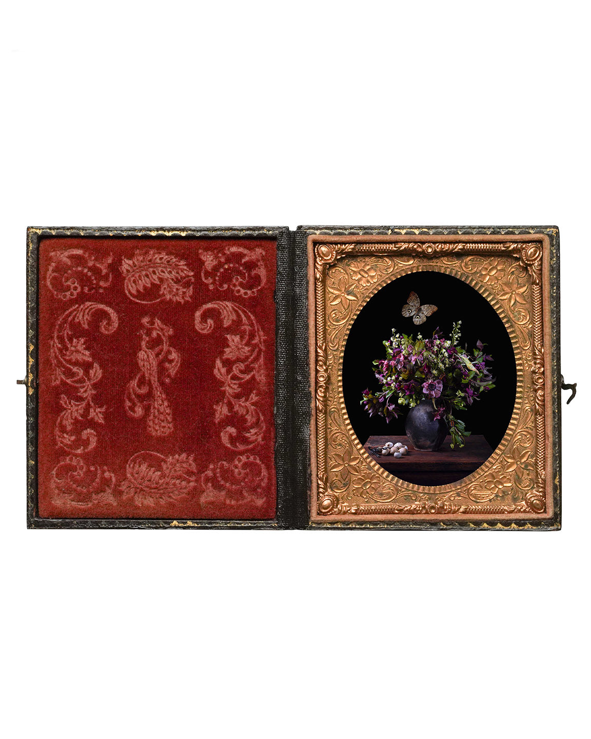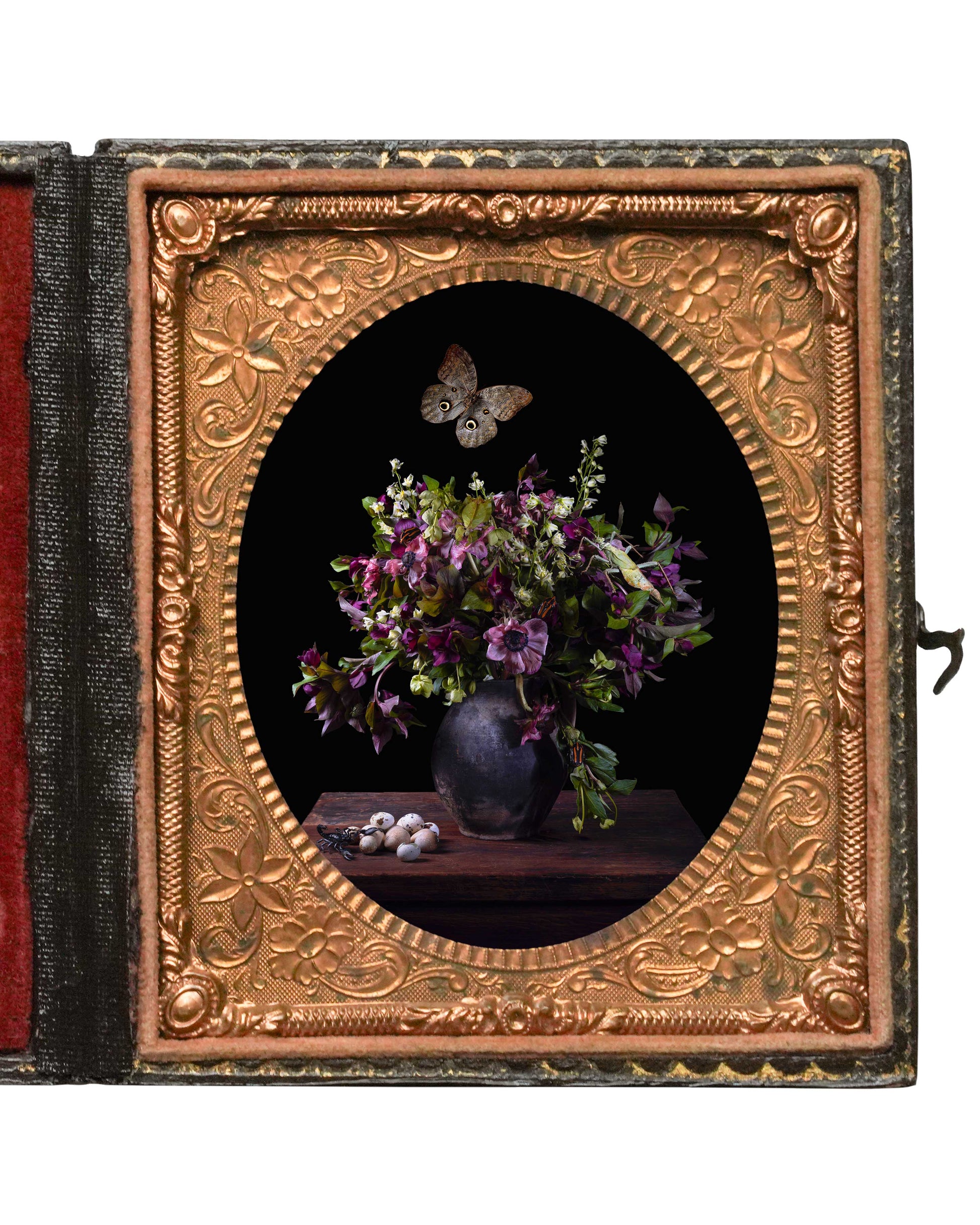 This carefully staged photograph titled, 'Spectre', captures a vivid tableau of purple, white and green flowers—delicate blossoms bursting with color—and the insects that live within. Inspired by 17th-century masters such as Rachel Ruysch and Pieter Claesz, this unique image brings the traditional vanitas genre into the contemporary. 'Spectre' is part of the ongoing Onweacnan series which encompasses works of neovictoriana still life.