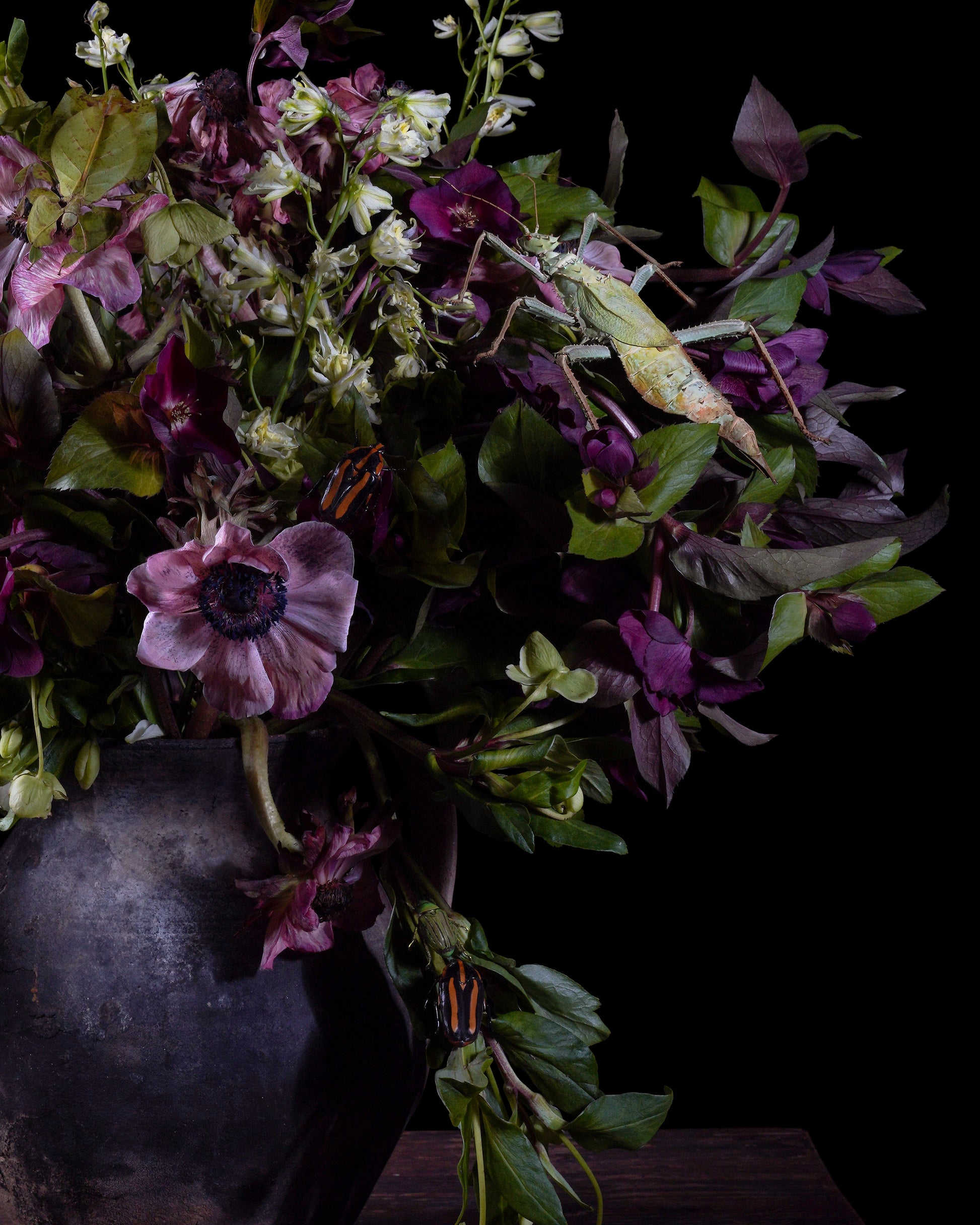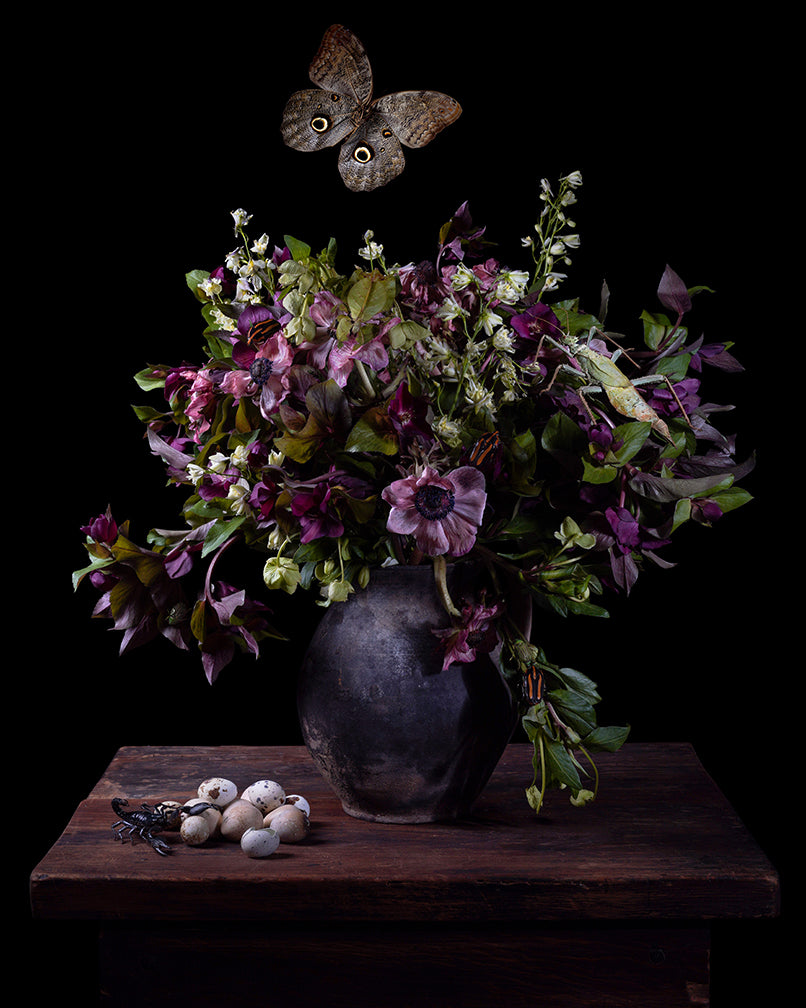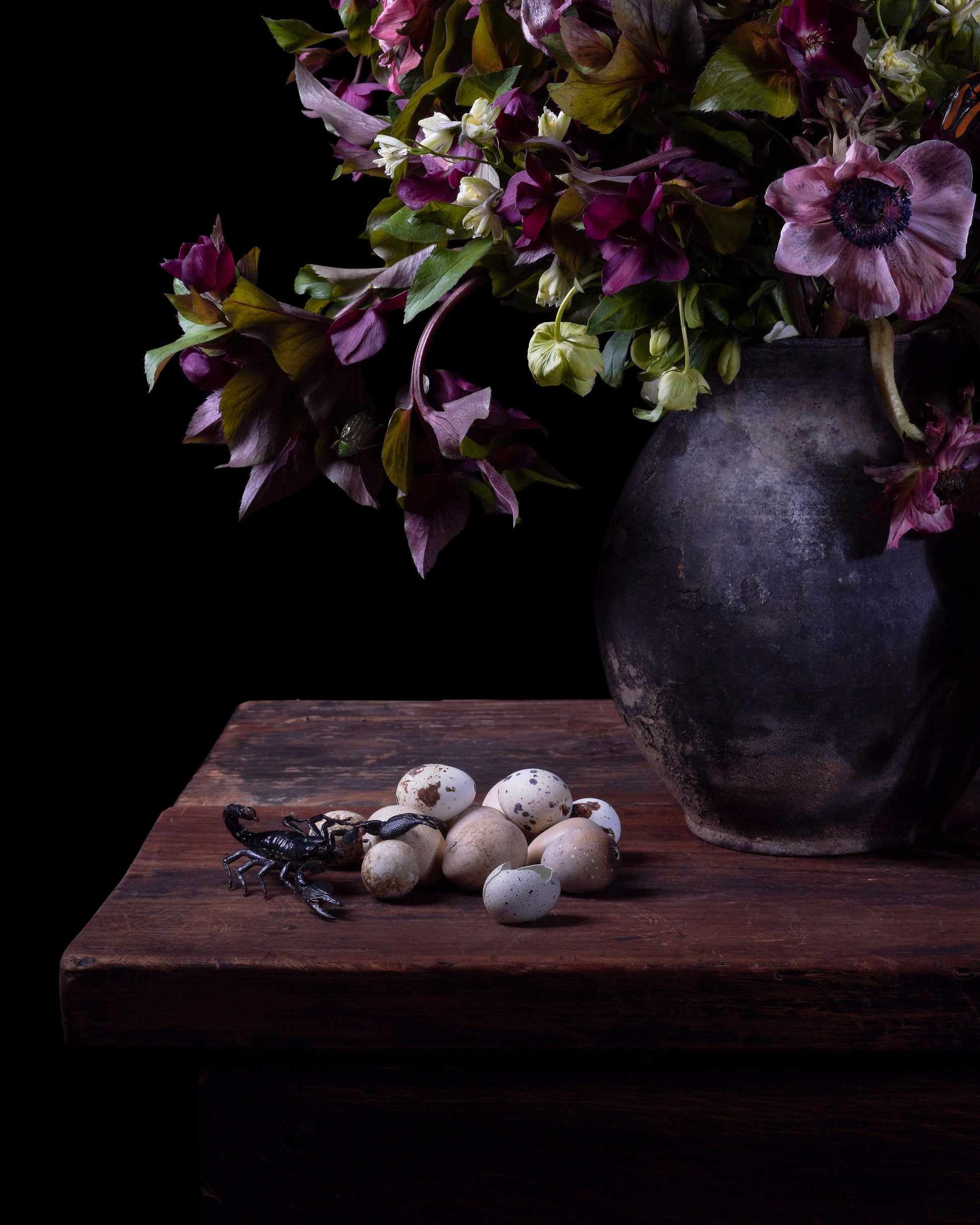 'Spectre' is part of the ongoing Onweacnan series which encompasses works of neovictoriana still life. Onweacnan was inspired by the artistโs preoccupation with our impermanence and the death rituals of cultures across time and the globe. Pulling from the vanitas tradition of seventeenth century Dutch Masters, the work combines contemporary mediums with Renaissance styling to speak to modern viewers of mortality, connection, and encourage inner contemplation.