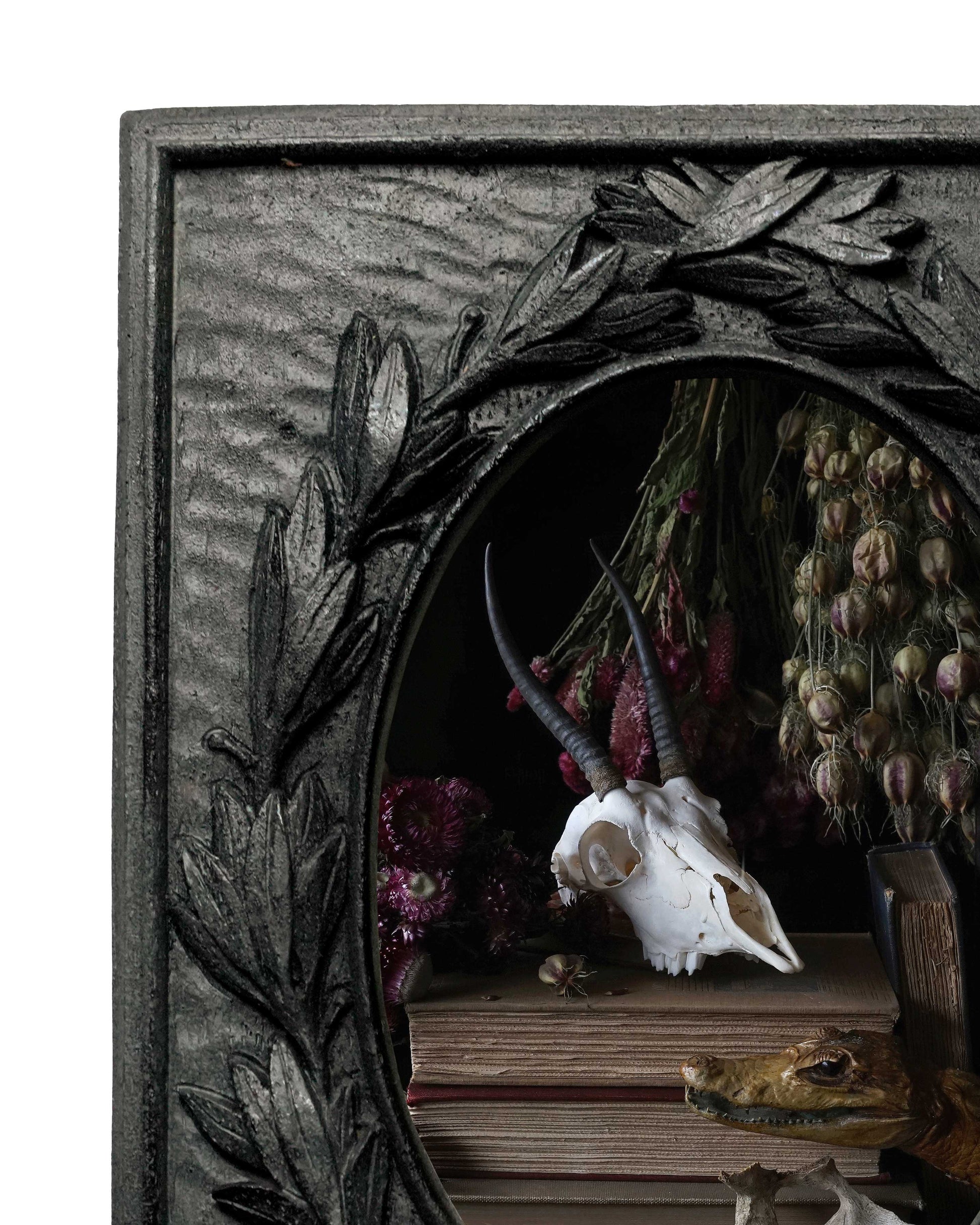 'Untitled 30' is a Neo-Victoriana still life photographic artwork that uses dramatic, Rembrandt-inspired lighting to highlight an antelope skull atop a stage of antique books, with dried flowers against a pitch black background. This composition evokes the Dutch Golden Age and Pieter Claesz, and is intended as a symbolic reminder of the passage of time and life's cycle.